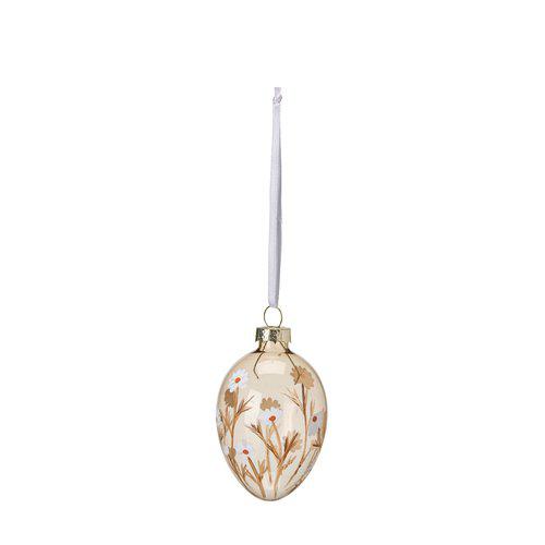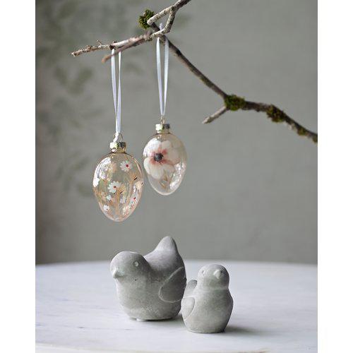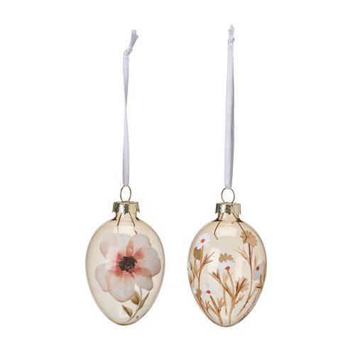 Blommönstrade glasägg i en svagt rosa nyans, 4x7cm.