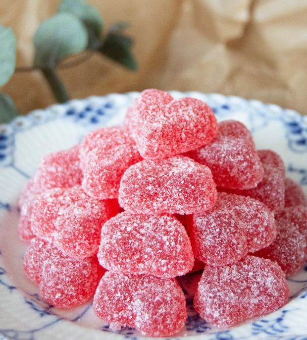 Socker, glukos-fruktossirap, vatten, gelatin, fuktighetsbevarande medel (sorbitol), surhetsreglerande medel (äppelsyra), aromämnen, färgämnen (E120).