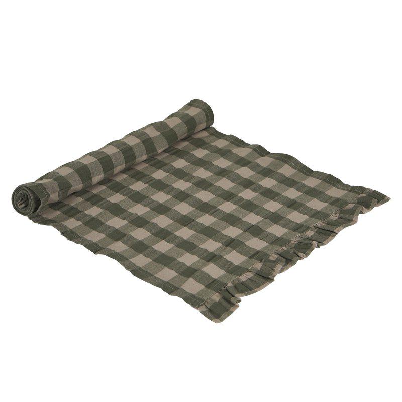 En löpare i bäckebölja med vacker volang på kortsidorna med ett klassiskt rutmönster är en elegant och inbjudande detalj för ditt matbord.