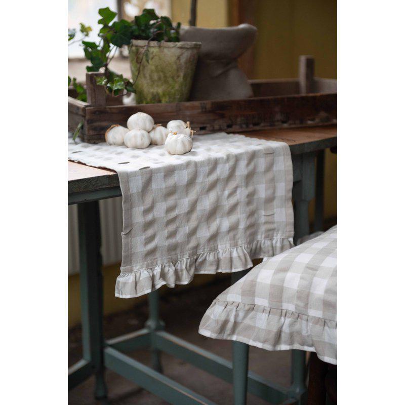 En löpare i bäckebölja med vacker volang på kortsidorna med ett klassiskt rutmönster är en elegant och inbjudande detalj för ditt matbord.