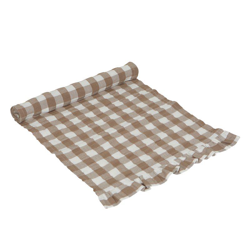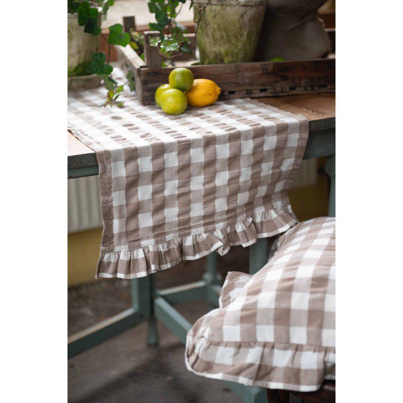 En löpare i bäckebölja med vacker volang på kortsidorna med ett klassiskt rutmönster är en elegant och inbjudande detalj för ditt matbord.