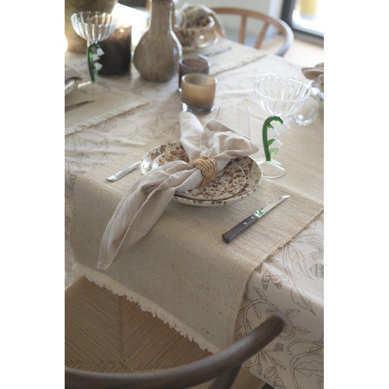 En enkel och fin löpare i jute- och bomullsblandning är en tidlös klassiker som passar perfekt för både vardag och högtid. Den naturliga strukturen i materialet ger ett rustikt men stilrent uttryck. De dekorativa fransar i ändarna ger löparen en mjuk och charmig avslutning.
